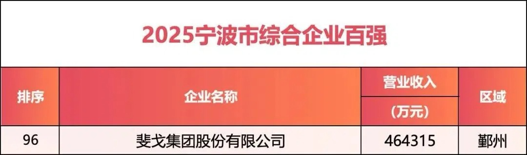 9月10日,宁波市企业联合会、宁波市企业家协会、宁波市工业经济联合会联合发布企业百强榜。斐戈集团凭借优异的综合力、出色的竞争力、稳健的发展力荣获“2025宁波市综合企业百强96位”、“2025宁波市制造业企业百强54位”。