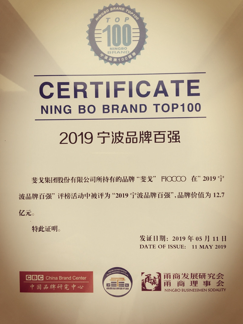 On the afternoon of May 11, the 2019 China (Ningbo) international professional manager talent summit and the press conference of "Ningbo top 100 brands" were grandly held in Ningbo Roman Lishe banquet hotel. FIOCCO group's "fiocco" brand has lived up to expectations, stood out from many brands, and was honored to be shortlisted in the list of top 100 brands in Ningbo in 2019, with a brand value of 1.27 billion.