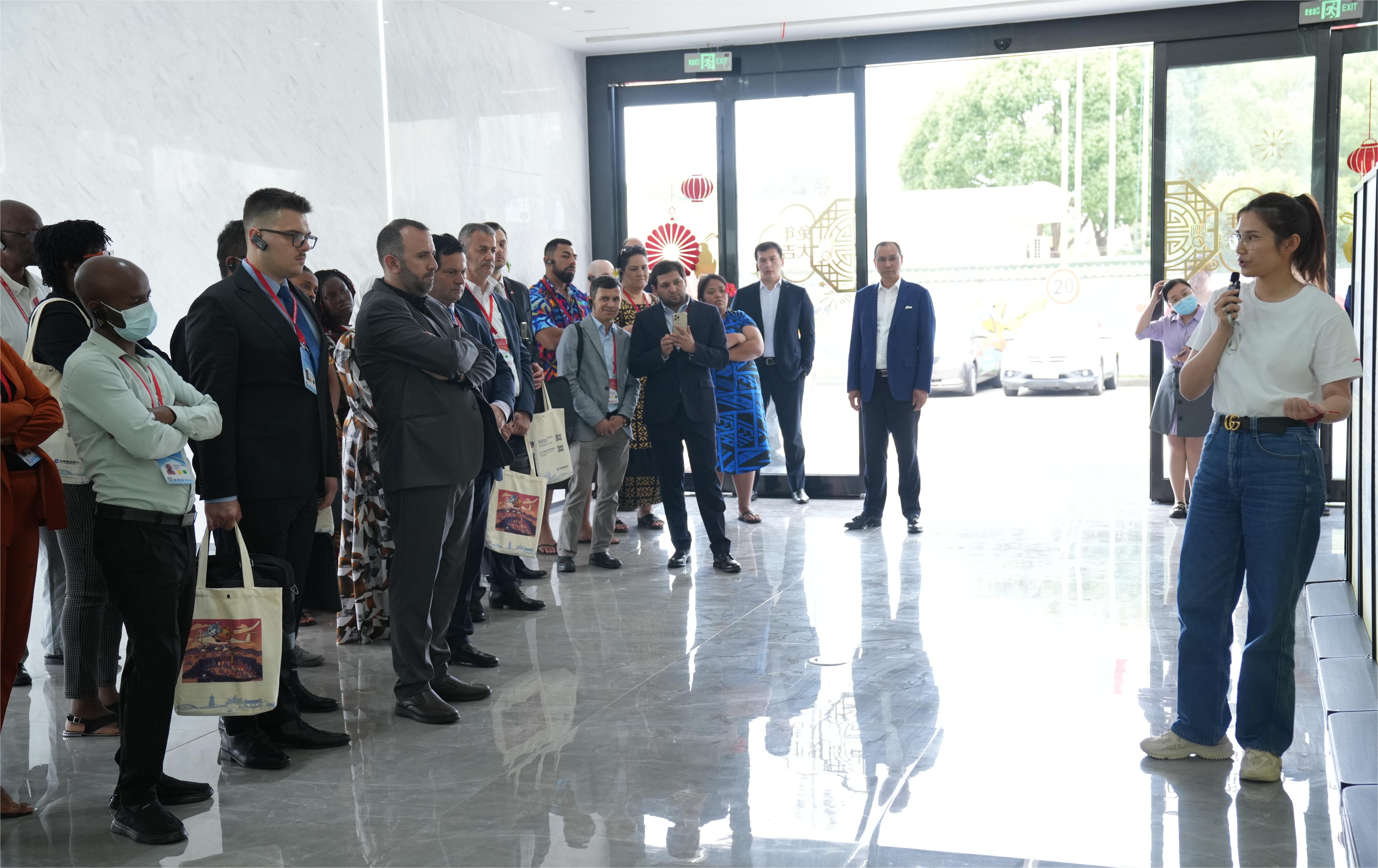That afternoon, a Central and Eastern European delegation visited FIOCCO Group for an inspection tour. The delegation comprised over 40 representatives from 20 countries including Hungary, Bulgaria, Greece, Uzbekistan, and Poland, featuring government officials, chamber of commerce leaders, chief representatives for China, and entrepreneurs. Zhao Dafang, Vice President of the Ningbo CCPIT (China Council for the Promotion of International Trade), and Wang Lixin, Director of the International Liaison Department of CCPIT, accompanied the visit. FIOCCO Group Chairman Shi Yun participated in receiving the guests, while Director & Vice President Shi Mei provided a full English explanation throughout.