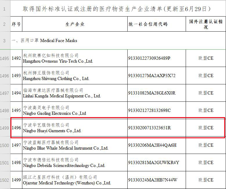 At the same time, Ningbo Huayi Clothing Co., Ltd. also successfully passed the approval of Zhejiang Provincial Drug Administration and obtained the class II medical device registration certificate, which means that the disposable medical mask produced by the company has been recognized by the state authorities in terms of quality testing and production links, and further enhanced the market competitiveness of the company's epidemic prevention products.