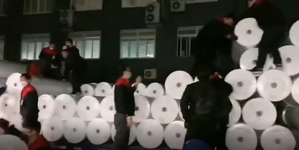After one hour's handling in the cold wind, all 208 tubes of 15 tons of fabrics were placed in the production workshop