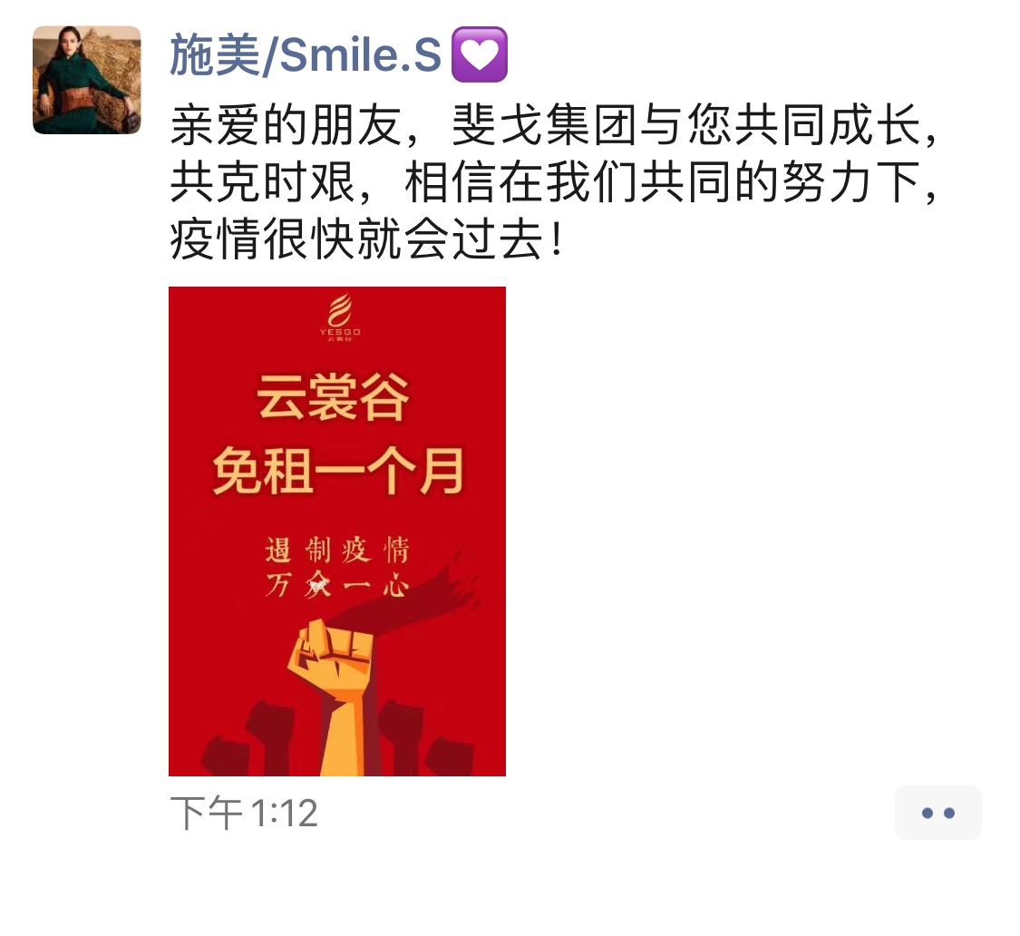 Shi Mei, the person in charge of YESGO Valley fashion science and Technology Park, told reporters that enterprises may face huge expenses such as employee salary payment, high rent, rent, utilities and so on when they encounter major public health emergencies and delay resumption of work. After discussion, the park decided that all enterprises settled in the park who return to work in strict accordance with the time required by the government, that is, after 24:00 on February 9, 2020, will be reduced or exempted from rent for one month. The purpose of this policy is to reduce the operating burden of various small and micro enterprises in the park.