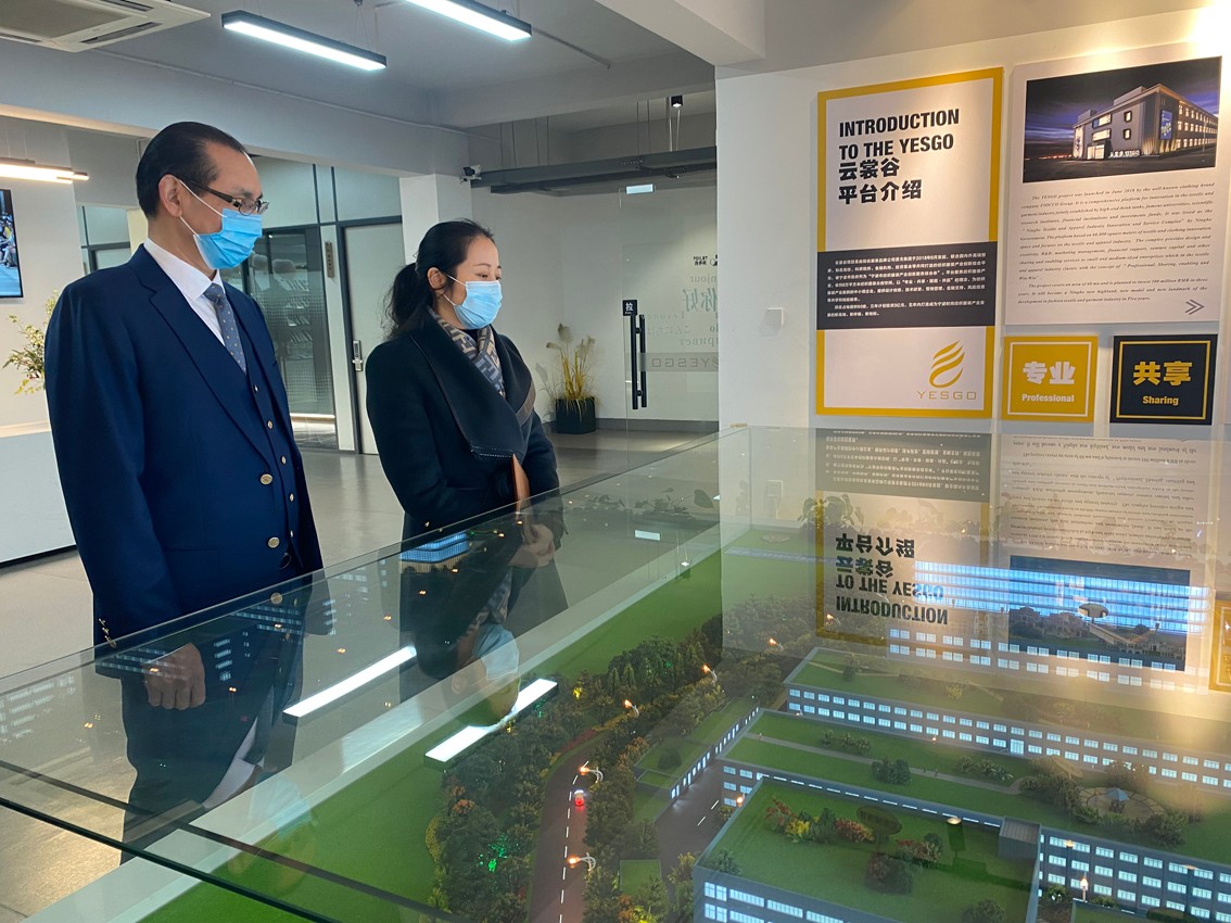 2月15日下午,鄞州区委常委、宣传部部长童丹霞一行莅临斐戈集团调研,在东郊街道韩洁书记、林佩燕副书记、集团董事长施云的陪同下参观了集团及云裳谷园区各项目。