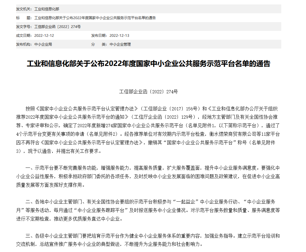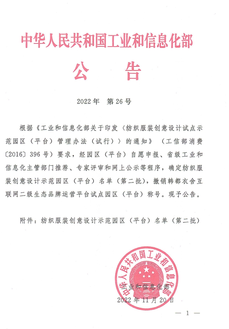 近日,工业和信息化部中小企业局公示了《2022年度国家中小企业公共服务示范平台名单》、《2022年度国家小型微型企业创业创新示范基地公示名单》,工业和信息化部消费品工业司公布了《纺织服装创意设计示范园区(平台)名单(第二批)》。以上名单,云裳谷时尚科技园均名列其中!三喜连门。