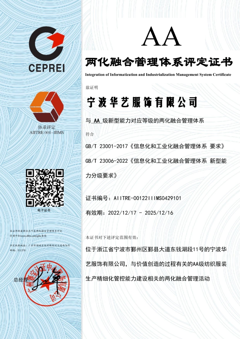 近日,浙江省科学技术厅公布2022年度省级备案众创空间名单,云裳谷时尚科技园喜提浙江省众创空间荣誉称号。此外,宁波华艺服饰有限公司也顺利通过国家工业和信息化部《信息化和工业化融合体系要求》(GB/T 23001-2017)与《信息化和工业化融合管理体系新型能力分级要求》(GB/T 23006-2022)认证评审,荣获两化融合管理体系AA级评定证书,通过全面实施两化融合贯标工作,在“规范化、精细化、科学化”方面持续提升企业管理水平。