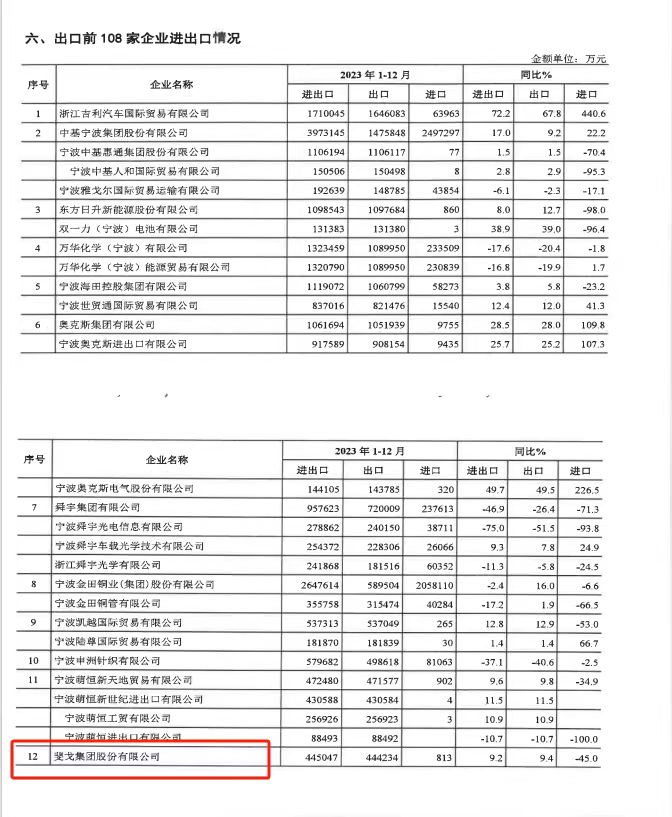 近日,宁波市商务局发布了2023年宁波市出口前 108 家企业榜单。其中,斐戈集团股份有限公司以444234万元出口额位列第12名。这佳绩的取得,彰显了斐戈集团在国际贸易领域的雄厚实力和卓越表现。
